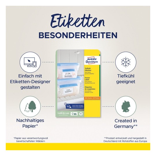Už se Vám někdy stalo, že jste v mrazáku objevili sáček s čímsi a nevzpomínáte si kdy a co jste do něj dali? Pečlivý popis zamrazovaných potravin má svůj smysl. Popište a označte je za pomoci našich etiket do mrazicích boxů. Tyto etikety jsou odolné vůči teplotám od -50°C do +70°C a lze je dokonce nalepit i na lehce zmrzlý podklad. Speciální lepidlo je vhodné pro přímý kontakt s osušenými a nemastnými potravinami. Etikety do mrazicích boxů L7975-25 z papíru v rozměru 30 x 50mm, který je odolný vůči chladu, Vás navíc přesvědčí prvotřídními tiskovými výsledky a prokázanou Top kvalitou. Ostrý tisk, který se nerozmazává a vysoká lepivost na nejrůznějších typech obalů (i na zakřivených nebo nepravidelných podkladech). Tyto vlastnosti našich etiket pravidelně testujeme ve vlastních laboratořích. Samozřejmě se můžete spolehnout na garanci plynulého tisku etiket a na to, že průchod archů etiket tiskárnou neznečistí tiskárnu lepidlem. Etikety do mrazicích boxů mohou být potisknuty na všech běžných typech tiskáren. Klimaticky neutrální společnost Avery Zweckform používá pouze zelenou elektřinu/plyn již od roku 2014. Výzkum, vývoj, výroba, logistika a administrativa v závodě v Oberlaindern/Bavorsko zaručují nejvyšší kvalitu a ekologické standardy a krátké dodací termíny. Svrchní materiál těchto bezchlórových bělených etiket je vyroben ze 100% FSC® certifikovaného papíru z udržitelně obhospodařovaných lesů.