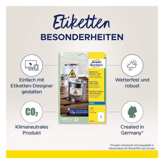 Bílé polyesterové etikety J4778-10 ve formátu 45,7 x 21,2 mm jsou mnohem odolnější než klasické papírové etikety. Skvěle se hodí pro trvalá a dlouhodobá značení v rušných prostrech průmyslových hal či skladů. Bez obav jimi můžete označit i venku stojící předměty. Mají vysokou lepivost, jsou odolné vůči mastnotě, znečištění, UV záření, vodě, natržení a výkyvům teplot od -20°C do +80°. Díky těmto vlastnostem si můžete být jisti, že Vaše označení vydrží na svém místě i za ztížených podmínek. Naše etikety Vás přesvědčí také prvotřídními tiskovými výsledky a prokázanou Top kvalitou. Ostrý tisk, který se nerozmazává a vysoká lepivost na nejrůznějších typech povrchů. Tyto vlastnosti našich etiket pravidelně testujeme ve vlastních laboratořích. Samozřejmě se můžete spolehnout na garanci plynulého tisku etiket a na to, že průchod archů etiket tiskárnou neznečistí tiskárnu lepidlem. Velmi odolné etikety mohou být potisknuty na všech běžných typech inkoustových tiskáren. Pár jednoduchých kroků pro dokonale vypadající etikety: Další servis, který Vám bezplatně nabízíme - aplikace pro tvorbu profesionálně vypadajících etiket Online Designer Avery® Design & Print. Zde naleznete jak prázdné šablony, do kterých vložíte vlastní text či obrázek, tak i široký výběr již navržených, moderních designů etiket, které pravidelně aktualizujeme a vylepšujeme. Jednoduše zadejte kód etikety, zpracujte, vytiskněte a máte hotovo! Klimaticky neutrální společnost Avery Zweckform používá pouze zelenou elektřinu/plyn již od roku 2014. Výzkum, vývoj, výroba, logistika a administrativa v závodě v Oberlaindern/Bavorsko zaručují nejvyšší kvalitu a ekologické standardy a krátké dodací termíny. Etikety z fólie bez PVC jsou vyráběny klimaticky neutrálním způsobem, emise materiálu jsou kompenzovány.